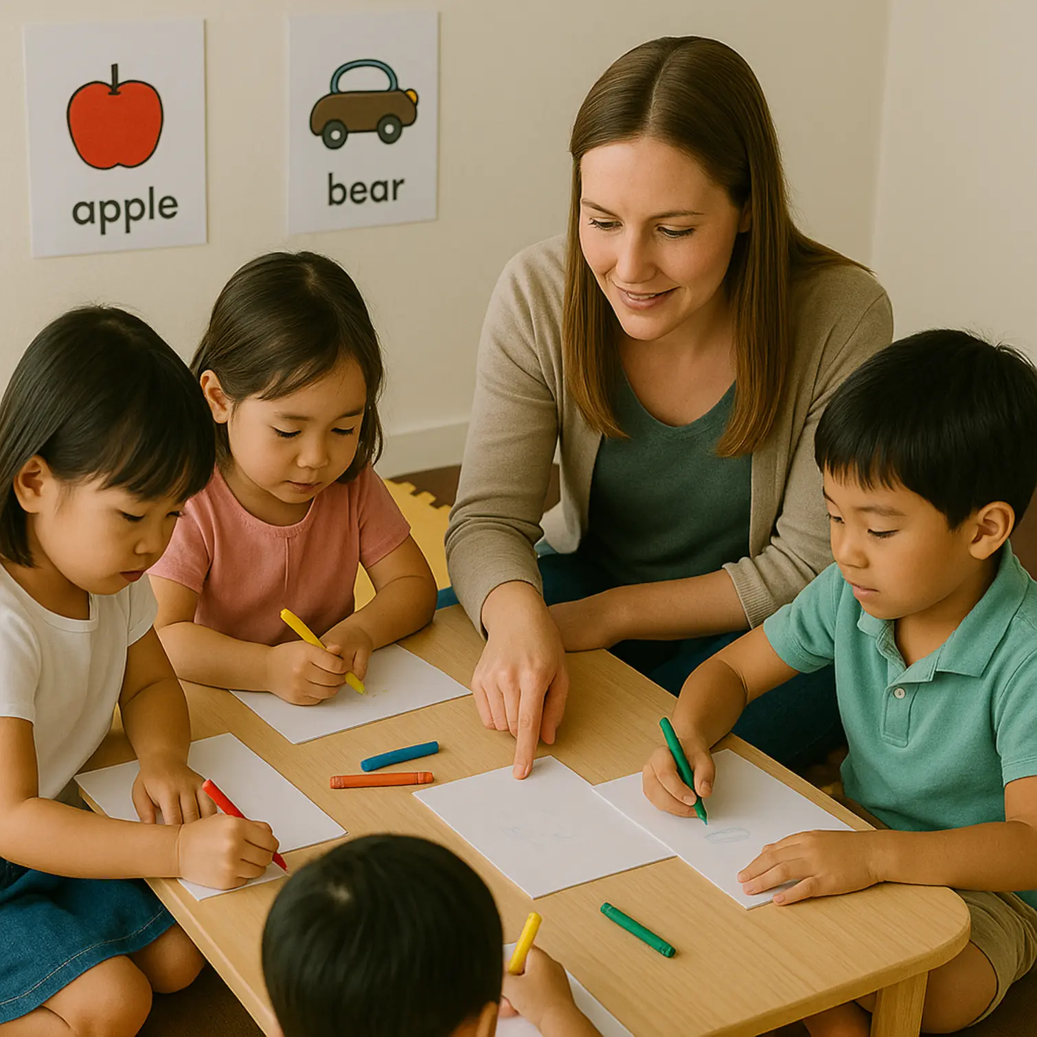 毎回のレッスンは「楽しく話す」「聞いてまねする」「少しずつ書く」をバランスよく積み重ねます。